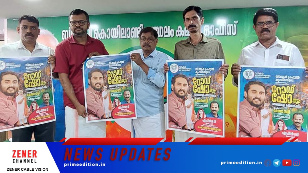 എന്ഡിഎ സ്ഥാനാർത്ഥി സിആര് പ്രഫുൽ കൃഷ്ണയുടെ തിരഞ്ഞെടുപ്പ് വിജയത്തിനായി ഏപ്രിൽ 8 ന് നടക്കുന്ന റോഡ് ഷോയുടെ പോസ്റ്റർ പ്രകാശനം ചെയ്തു