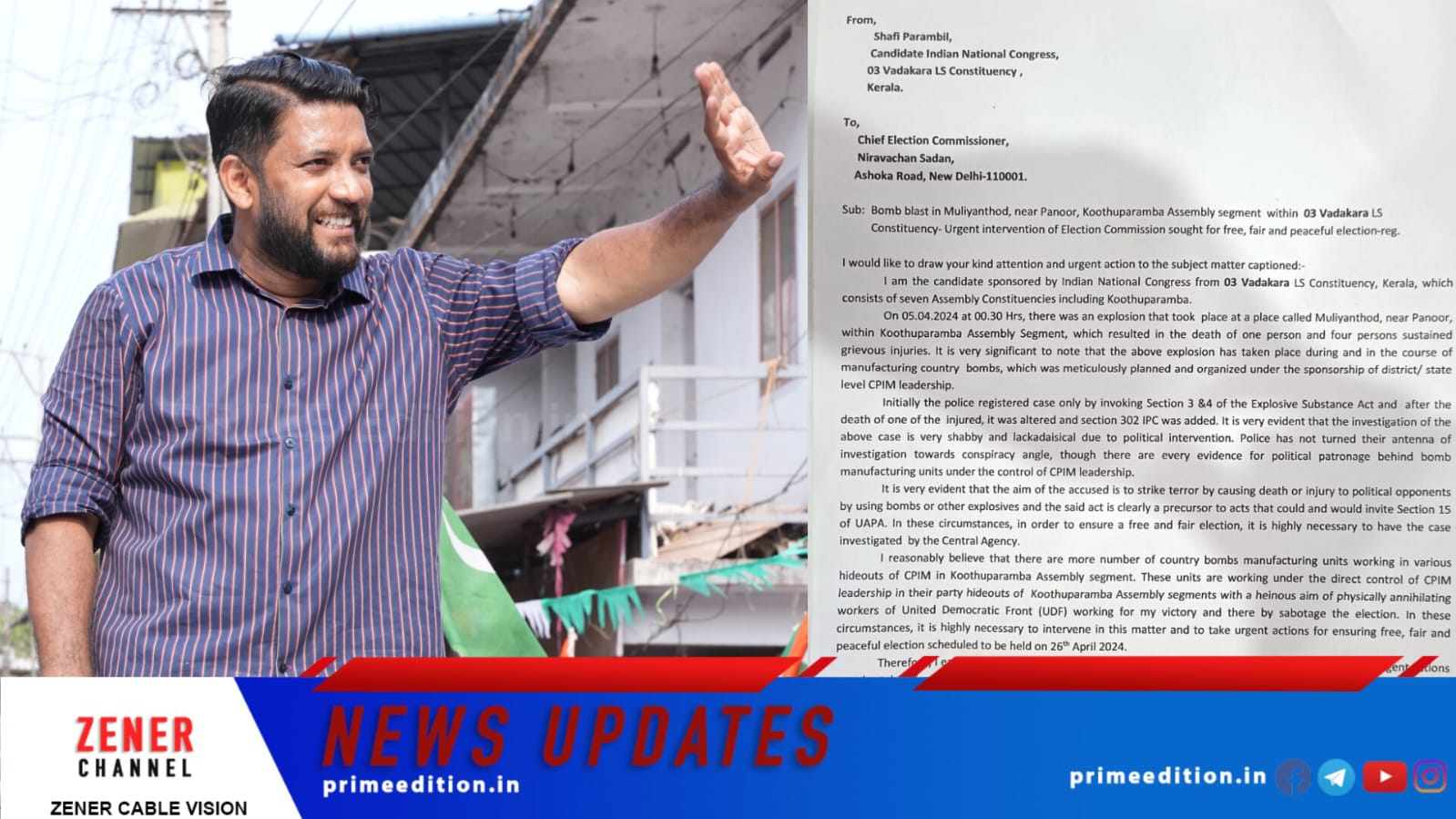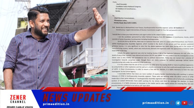 പാനൂരിൽ ബോംബ് നിർമ്മാണത്തിനിടെയുണ്ടായ സ്ഫോടനം കേന്ദ്ര ഏജൻസി അന്വേഷിക്കണം: തിരഞ്ഞെടുപ്പ് കമ്മിഷന് പരാതി നൽകി ഷാഫി പറമ്പിൽ