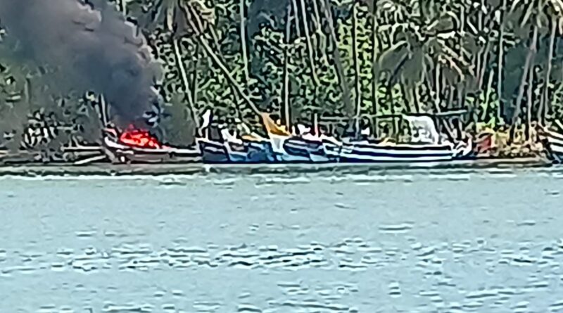 കോരപ്പുഴയില്‍ മൂന്ന് ഫൈബര്‍ വള്ളങ്ങള്‍ കത്തിനശിച്ചു, തീപിടിത്തത്തിന്റെ കാരണം വ്യക്തമല്ല.
