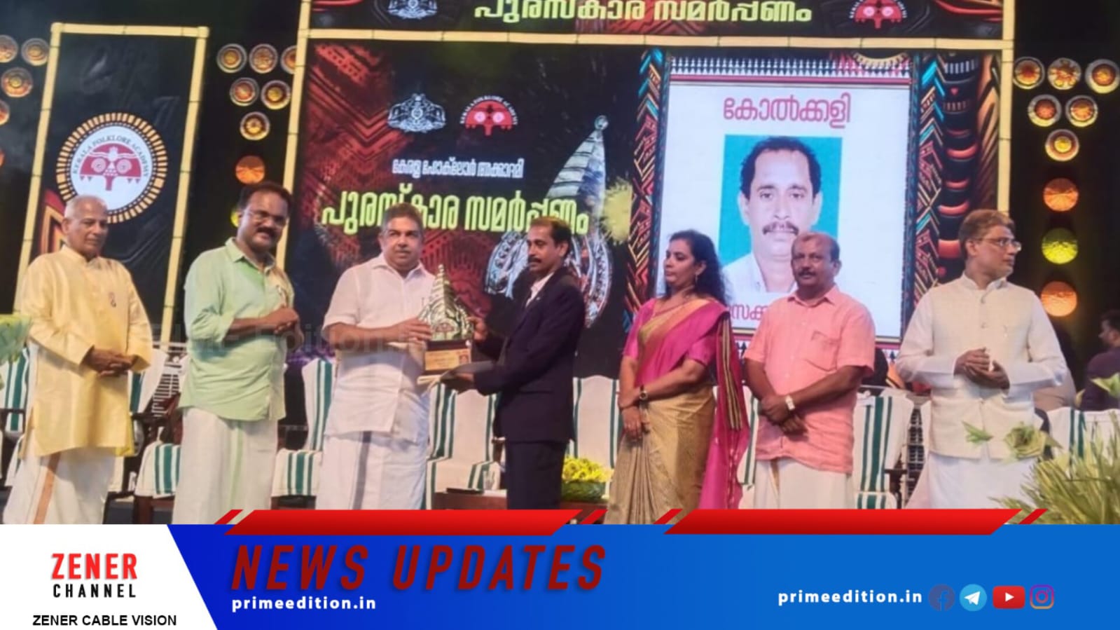 കേരള ഫോക്ലോര് അക്കാദമി അവാര്ഡ് കോല്ക്കളി ആചാര്യന് മുസക്കുട്ടി ഗുരുക്കള് സാസ്കാരിക വകുപ്പ് മന്ത്രിയില് നിന്നും ഏറ്റുവാങ്ങി