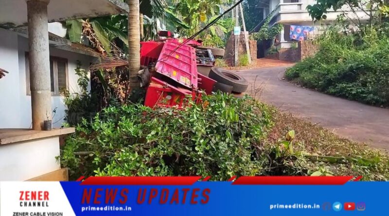 വീട്ടുമുറ്റത്തേക്ക് മറഞ്ഞ ലോറി തെങ്ങിൽ തട്ടി നിന്നതിനാൽ വലിയ അപകടമാണ് ഒഴിവായത്. വലിയ കയറ്റവും വളവും ഉള്ള ഭാഗത്ത് ലോറിയുടെ നിയന്ത്രണം നഷ്ടപ്പെട്ട് പിന്നിലോട്ട് പതിക്കുകയായിരുന്നു. ലോറിയിൽ ഉണ്ടായിരുന്ന ഡ്രൈവർ ഉൾപ്പെടെയുള്ളവർ പരിക്കുകൾ ഏൽക്കാതെ രക്ഷപ്പെട്ടു.
