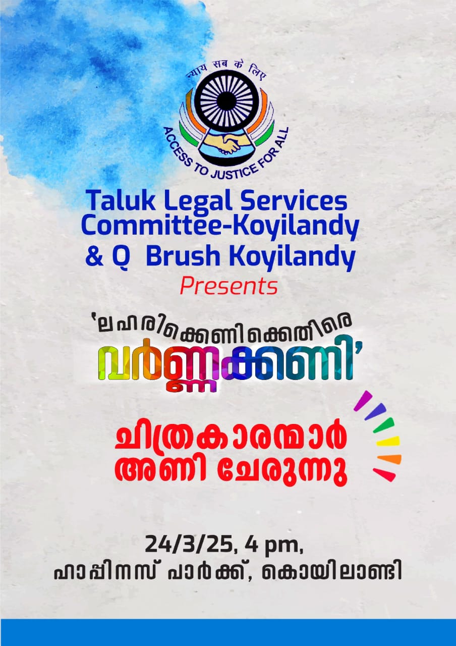 കൊയിലാണ്ടി താലൂക്ക് ലീഗല് സര്വീസസ് കമ്മിറ്റി ചിത്രകാരന്മാരുടെ കൂട്ടായ്മയും ചേര്ന്ന് ‘ലഹരിക്കെണിക്കെതിരെ വര്ണ്ണക്കണി’ നാളെ വൈകീട്ട്