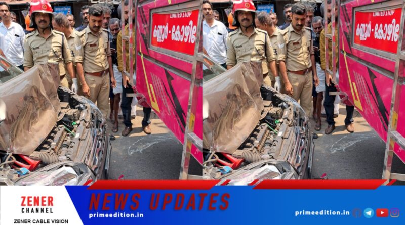 ബസ്സിന് പിറകില് കാറിടിച്ച് അപകടം, വാഹനങ്ങള് വേര്പെടുത്താന് അഗ്നി രക്ഷാസേനയുടെ സഹായംതേടി