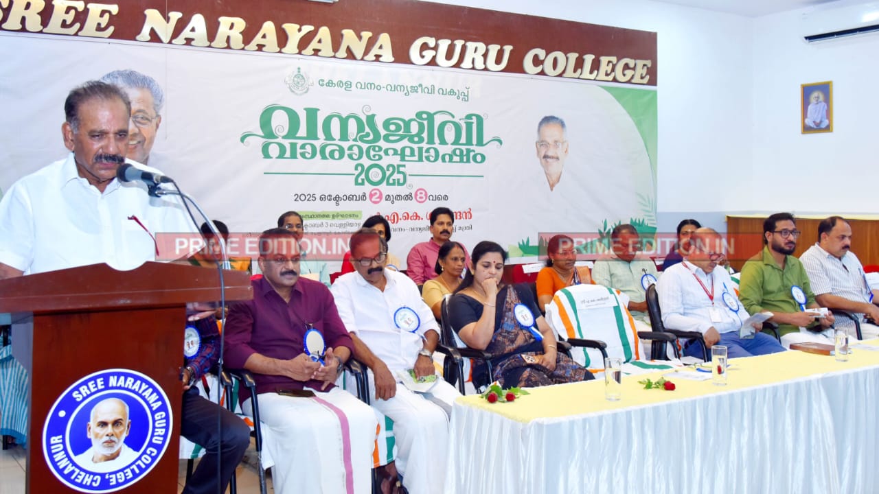 ചേളന്നൂര് ശ്രീനാരായണഗുരു കോളേജില് നടന്ന ചടങ്ങില് ജില്ലാ പഞ്ചായത്ത് പ്രസിഡന്റ് ഷീജ ശശി അധ്യക്ഷയായി. വന്യജീവി വാരാഘോഷ സന്ദേശം ഡിവിഷണല് ഫോറസ്റ്റ് ഓഫീസര് വി പി ജയപ്രകാശ് കൈമാറി. എഴുത്തുകാരന് റിഹാന് റാഷിദ് മുഖ്യ പ്രഭാഷണം നടത്തി. ഗ്രാമപഞ്ചായത്ത് പ്രസിഡന്റുമാരായ പി പി നൗഷീര്, കെ ടി പ്രമീള, സി എം ഷാജി, കൃഷ്ണവേണി മാണിക്കോത്ത്, എ സരിത, ജില്ലാ പഞ്ചായത്ത് അംഗം ഇ ശശീന്ദ്രന്, ചേളന്നൂര് ബ്ലോക്ക് പഞ്ചായത്ത് വികസന സ്റ്റാന്ഡിങ് കമ്മിറ്റി ചെയര്പേഴ്സന് ഹരിദാസന് ഈച്ചരോത്ത്, ചേളന്നൂര് ബ്ലോക്ക് പഞ്ചായത്ത് അംഗം ഐഷാബി, ചേളന്നൂര് ഗ്രാമപഞ്ചായത്ത് അംഗങ്ങളായ കവിത, എന് രമേശന്, കൗണ്സിലര് എം എസ് തുഷാര, ചീഫ് വൈല്ഡ്ലൈഫ് വാര്ഡന് ആന്ഡ് അഡീഷണല് പ്രിന്സിപ്പല് ചീഫ് ഫോറസ്റ്റ് കണ്സര്വേറ്റര് പ്രമോദ് ജി കൃഷ്ണന്, സോഷ്യല് ഫോറസ്ട്രി ഫോറസ്റ്റ് കണ്സര്വേറ്റര് ആര് കീര്ത്തി, വര്ക്കിങ് പ്ലാന് ഓഫീസര് പി കെ ആസിഫ്, ഡിവിഷണല് ഫോറസ്റ്റ് ഓഫീസര്മാരായ വി സന്തോഷ് കുമാര്, യു ആഷിഖ് അലി, അസി. ഫോറസ്റ്റ് കണ്സര്വേറ്റര്മാരായ എ പി ഇംതിയാസ്, സത്യപ്രഭ, കെ നീതു, ശ്രീനാരായണഗുരു കോളേജ് പ്രിന്സിപ്പല് എസ് പി കുമാര്, ഡോ. ഇ എസ് അഭിലാഷ്, ജനപ്രതിനിധികള്, ഉദ്യോഗസ്ഥര് എന്നിവര് സംസാരിച്ചു. തുടര്ന്ന് വയനാട് വന്യജീവി സങ്കേതം അസി. ഫോറസ്റ്റ് കണ്സര്വേറ്റര് എം ജോഷില് നയിച്ച വൈല്ഡ് ലൈഫ് ക്വിസ് നടന്നു.