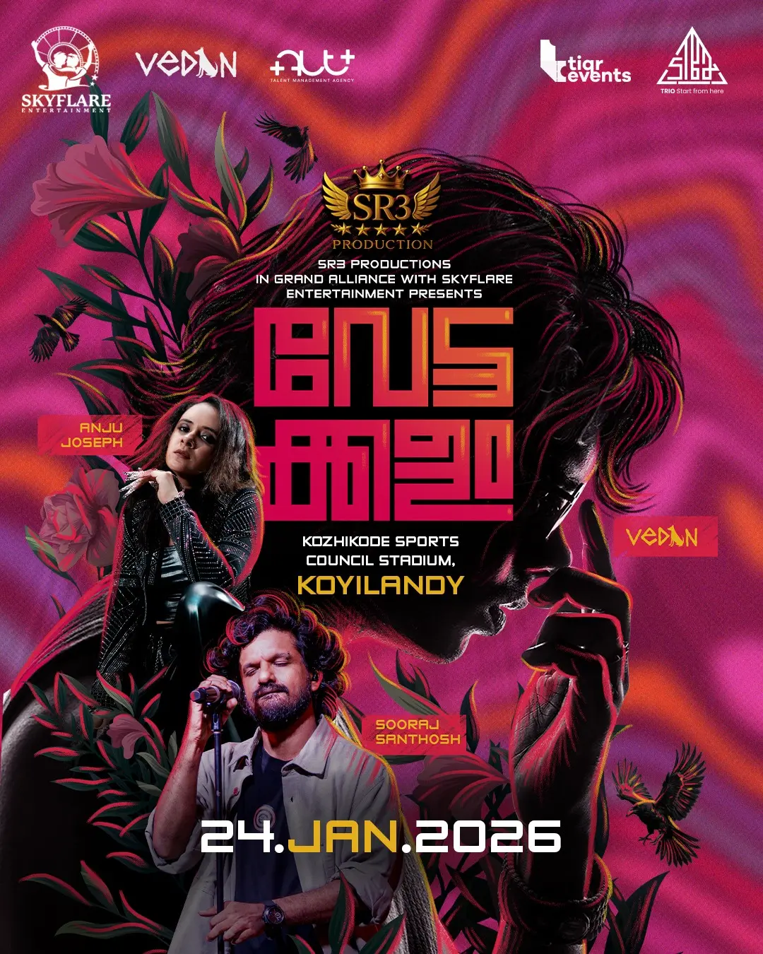 സിംഗർമാരായ വേടൻ, അഞ്ജു ജോസഫ്, സൂരജ് സന്തോഷ് എന്നിവരെ അണി നിരത്തി എസ്ആർ3 പ്രൊഡഷൻ നേതൃത്വം നൽകും