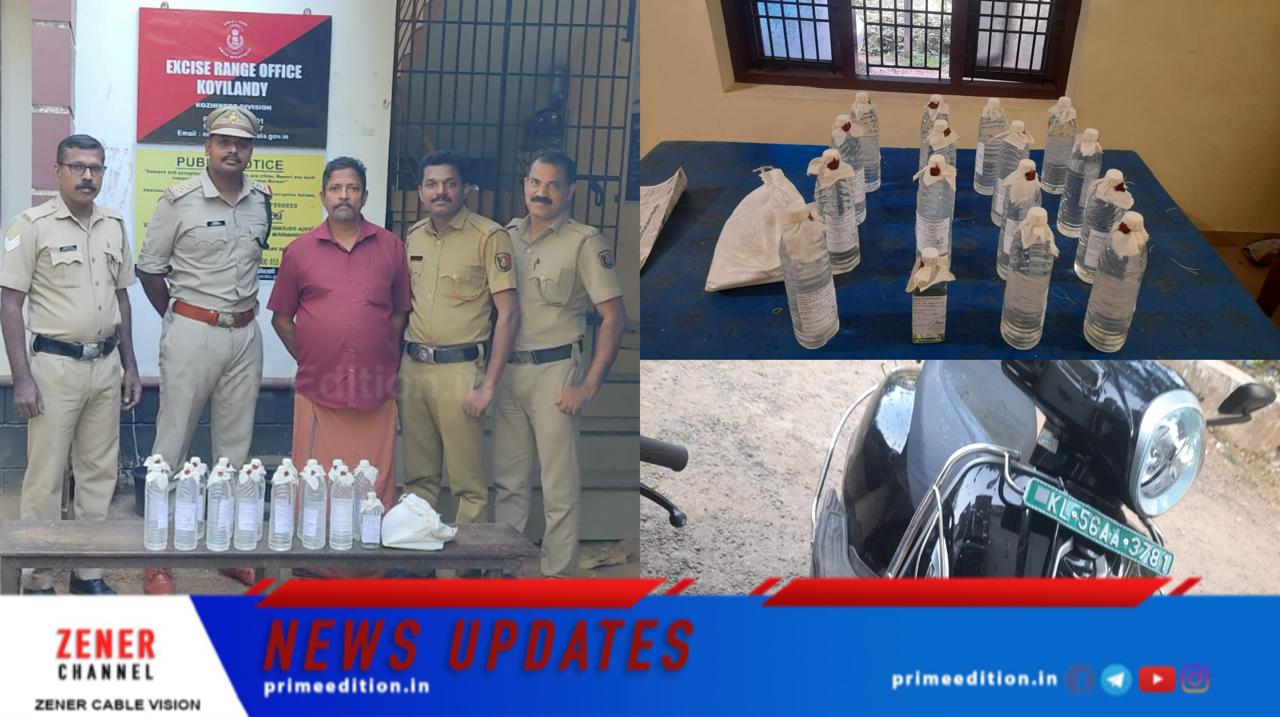 സ്കൂട്ടറില് കടത്തുകയായിരുന്ന 15 ലിറ്റര് ചാരായവുമായി ചേലിയ സ്വദേശി എക്സൈസ് പിടിയില്