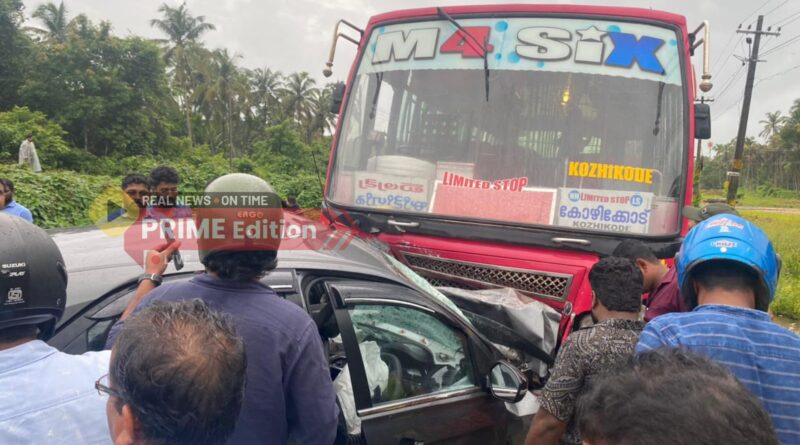 കണ്ണൂരില് നിന്ന് കോഴിക്കോടേക്ക് ഭാഗത്തെക്ക് പോകുന്ന ബസ്സും കോഴിക്കോട് നിന്നും കൊയിലാണ്ടി ഭാഗത്തേക്ക് വരുന്ന കാറുമാണ് കൂട്ടിയിടിച്ചത്. കാറില് യാത്ര ചെയ്ത 5 പേരെ ആശുപത്രിയിലേക്ക് മാറ്റി, കൊയിലാണ്ടി പോലീസ് സ്ഥലത്തെത്തി തടസ്സപ്പെട്ട ഗതാഗതം പുനസ്ഥാപിച്ചു.