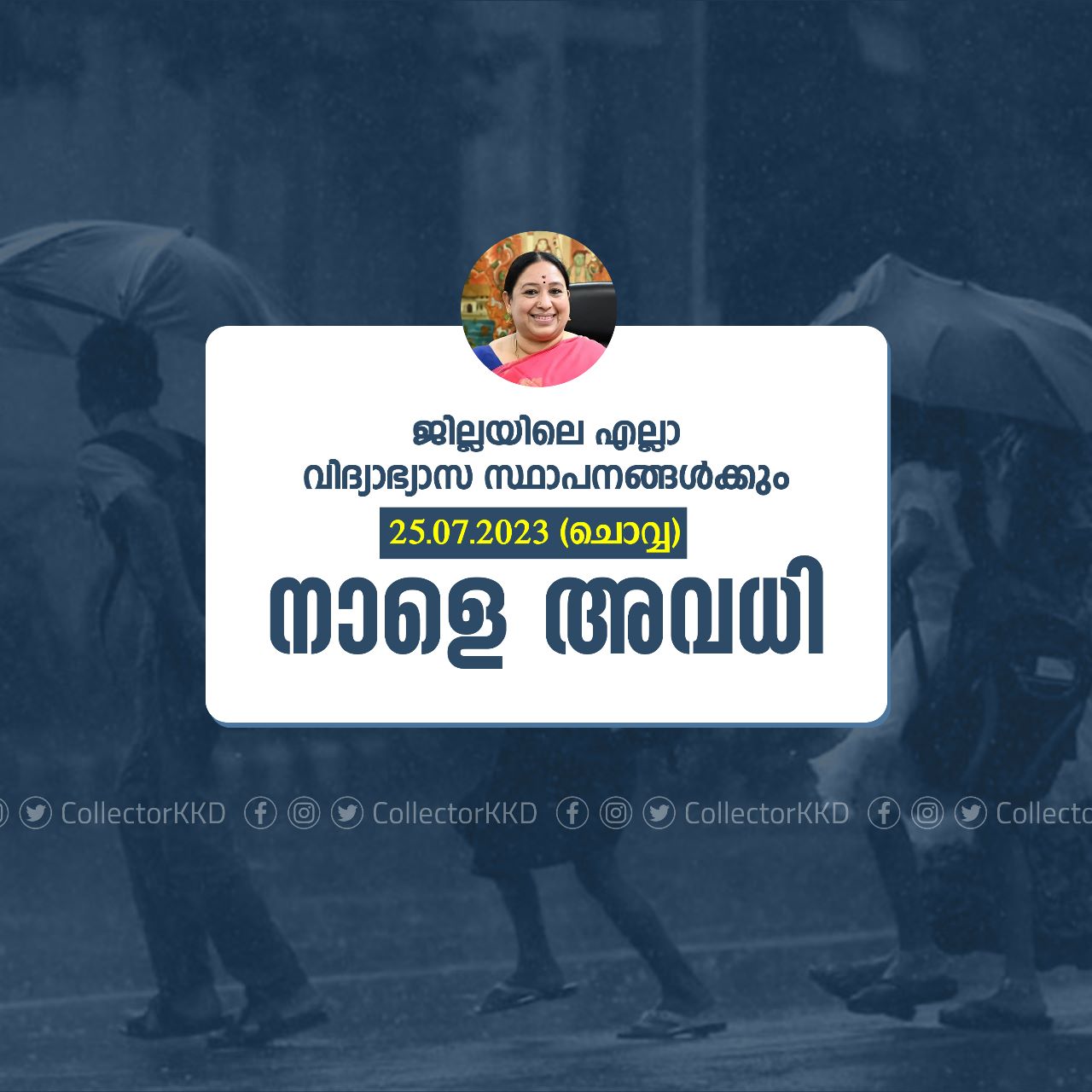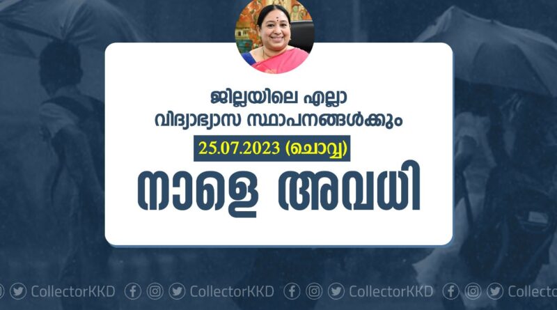ജില്ലയിൽ മഴ തുടരുന്നതിനാലും പലയിടങ്ങളിലായി വെള്ളക്കെട്ടും ശക്തമായ കാറ്റുമുള്ളതിനാലും, നദീതീരങ്ങളിൽ ക്രമാതീതമായി വെള്ളം ഉയരുന്ന സാഹചര്യം നിലനിൽക്കുന്നതിനാലും പ്രൊഫഷണൽ കോളേജ് ഉൾപ്പെടെയുള്ള എല്ലാ വിദ്യാഭ്യാസ സ്ഥാപനങ്ങൾക്കും നാളെയും (ജൂലൈ 25) അവധിയാണ്. ജില്ലയിലെ അങ്കണവാടികള്ക്കും അവധി ബാധകമാണ്. മുൻകൂട്ടി നിശ്ചയിച്ച പരീക്ഷകളിൽ മാറ്റമില്ല.